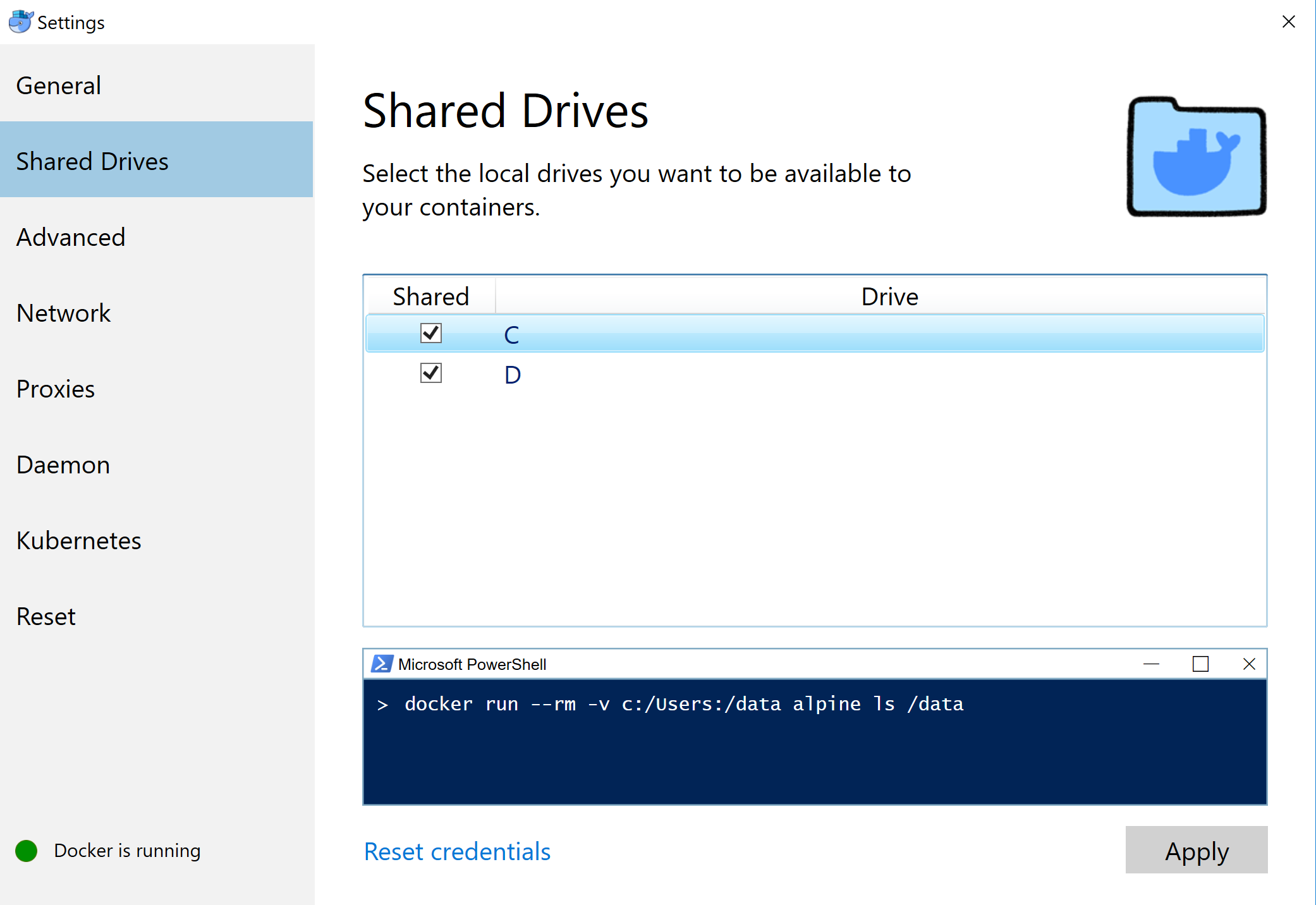 Please go to the advanced tab, and click the drivers you wish to share with the docker container. Note: if your homework is located on Disk-D, you may not select Disk-C, this could make your operation system more safe.