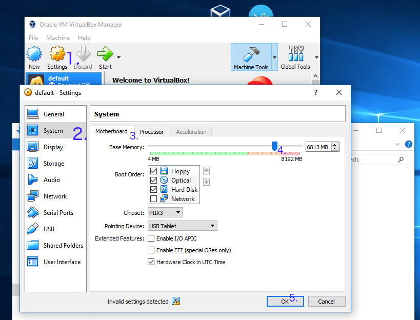 Click 'Docker Quickstart Terminal', you should able to start a bash session. Close it, click virtual box. You may find there is one virtual machine is in running. Close this machine, update the maximum base memory.